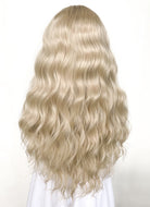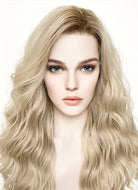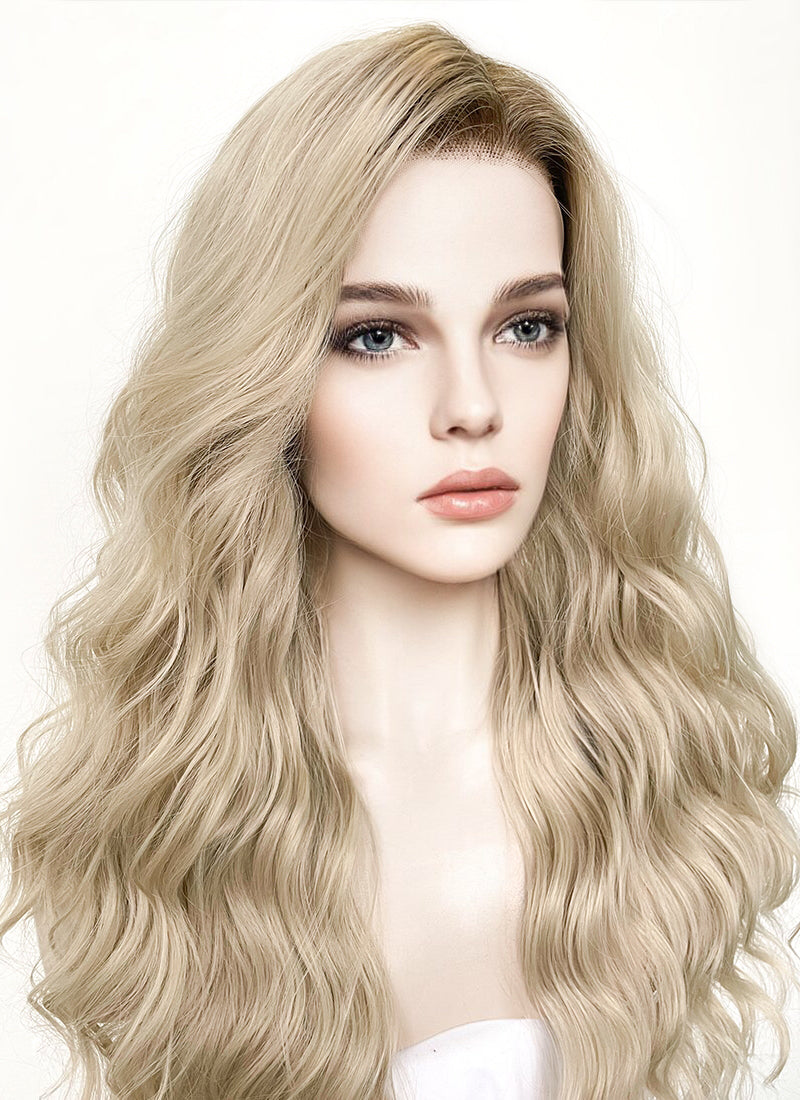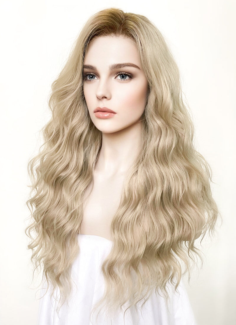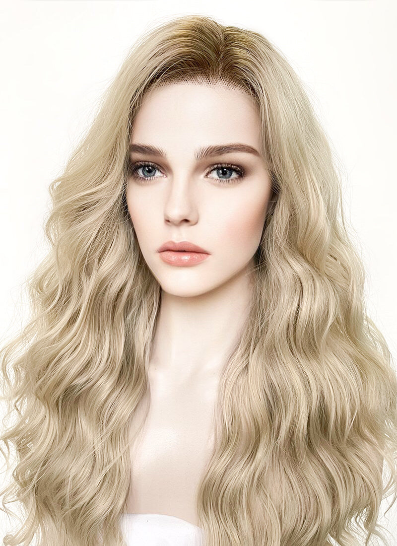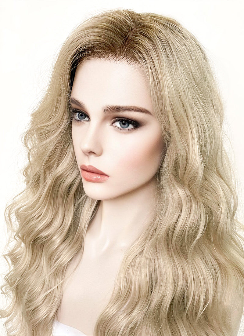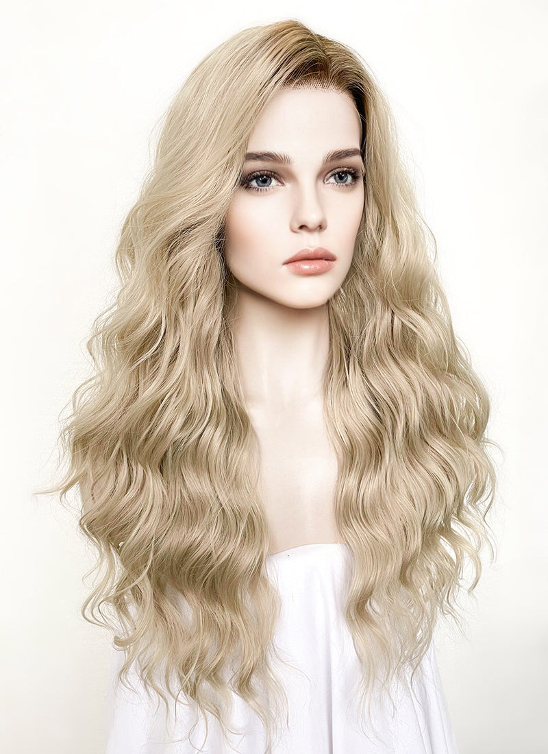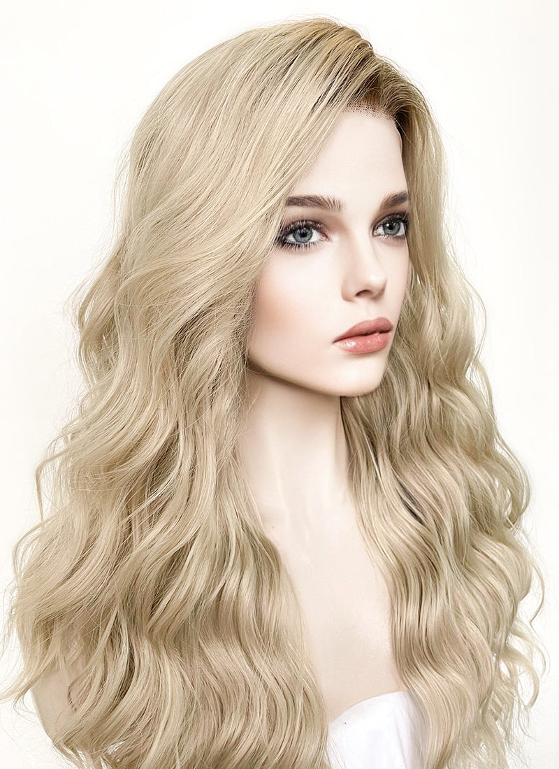 Long Wavy Ash Blonde With Brown Roots Lace Front Synthetic Hair Wig LFK5501