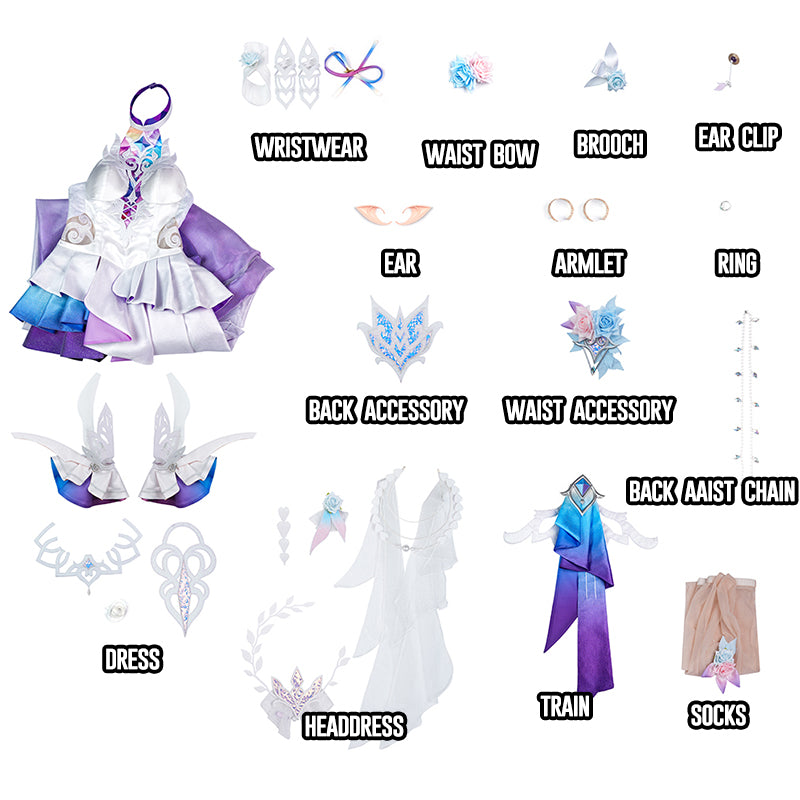 Including: Dress, Wristwear, Waist Bow, Brooch, Ear Clip, Ear, Armlet, Ring, Back Accessory, Waist Accessory, Back Aaist Chain, Headdress, Train, Socks
