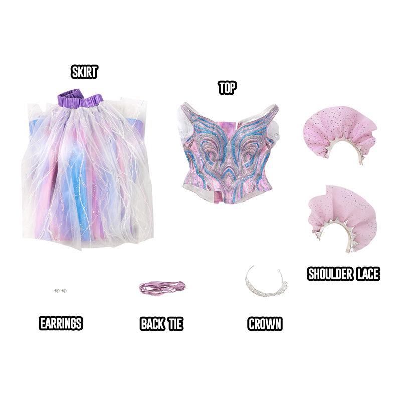Including: Skirt, Top, Earring, Back Tie, Crown, Shoulder Lace