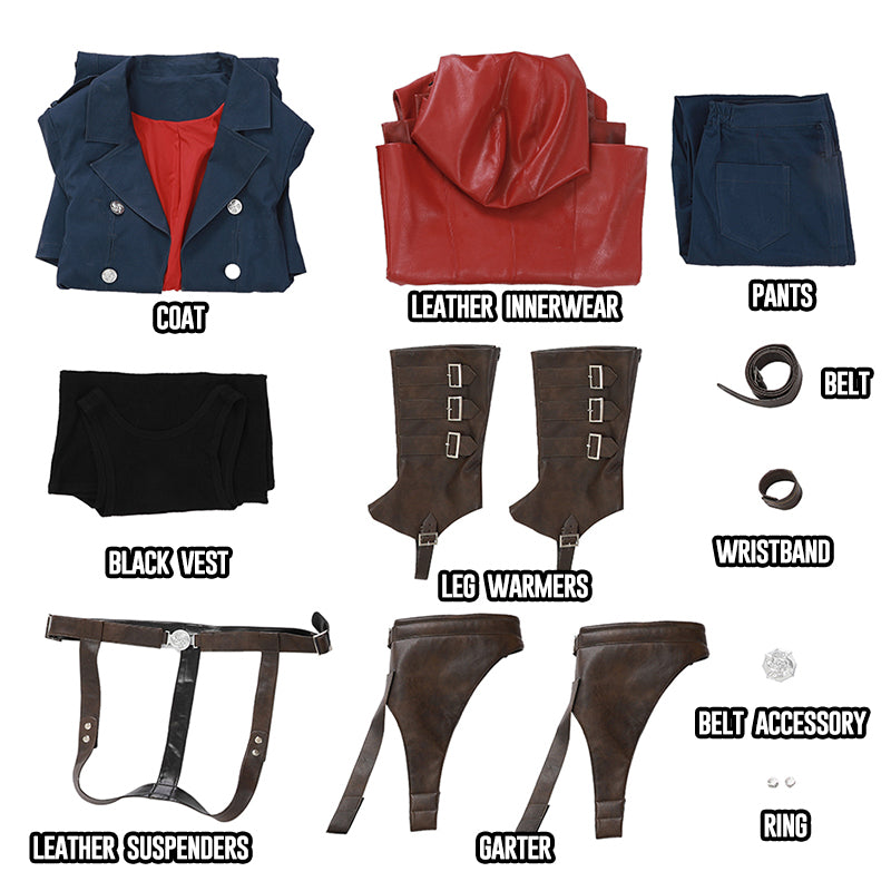 Including: Coat, Leather Innerwear, Pants, Black Vest, Leg Warmers, Belt, Wristband, Leather Suspenders, Garter, Belt Accessory, Ring