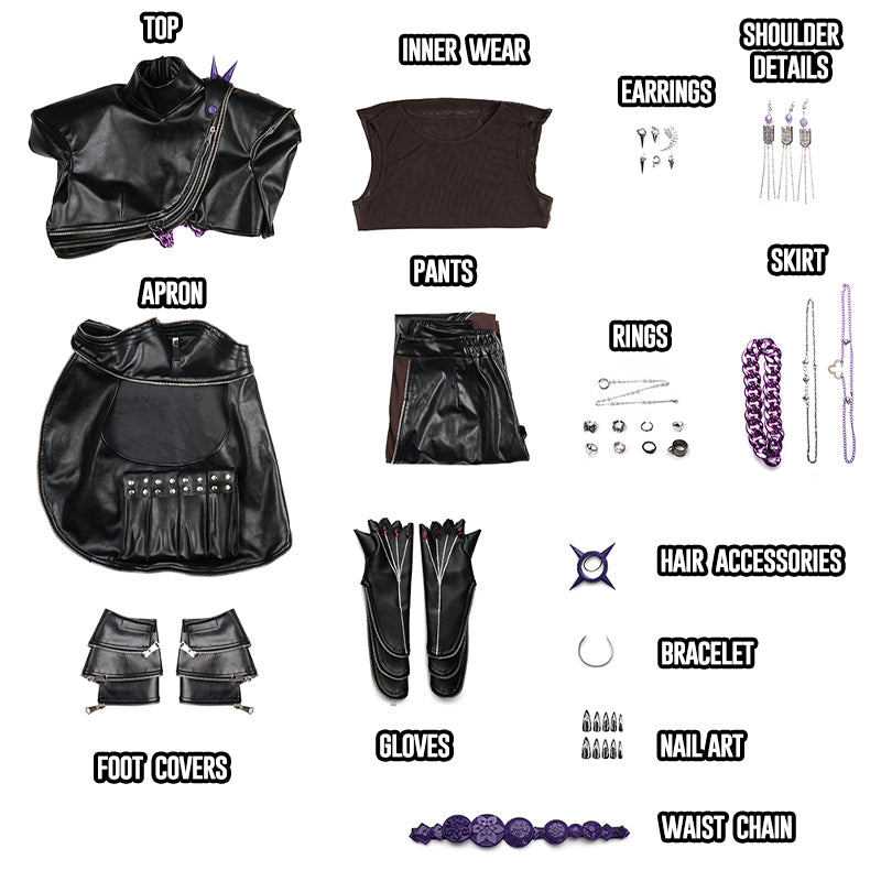 Including: Top, Apron, Foot Covers, Inner Wear, Pants, Gloves, Earrings, Shoulder Details, Rings, Skirt, Hair Accessories, Bracelet, Nailart, Waist Chain