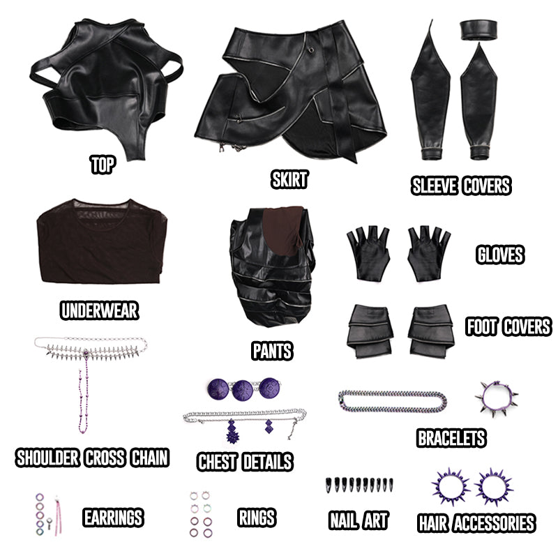 Including: Top, Skirt, Sleeve Covers, Underwear, Pant, Gloves, Foot Covers, Shoulder Cross Chan, Chest Details, Bracelets,Earrings, Rings, Nail Art, Hair Accessories