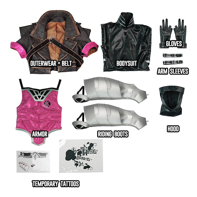 Including: Outerwear + Belt, Bodysuit, Gloves, Arm Sleeves, Armor, Riding Boots, Hood, Temporary Tattoos