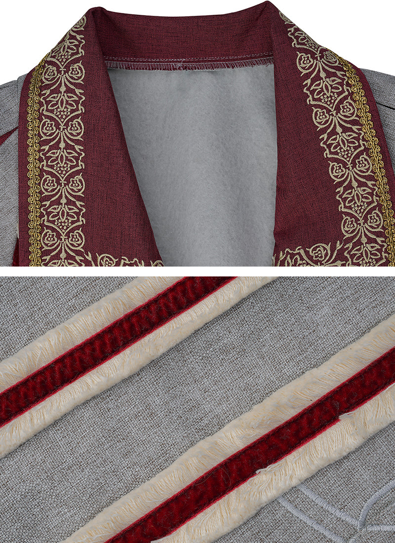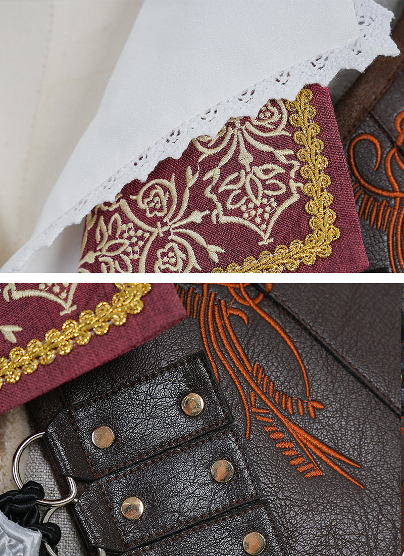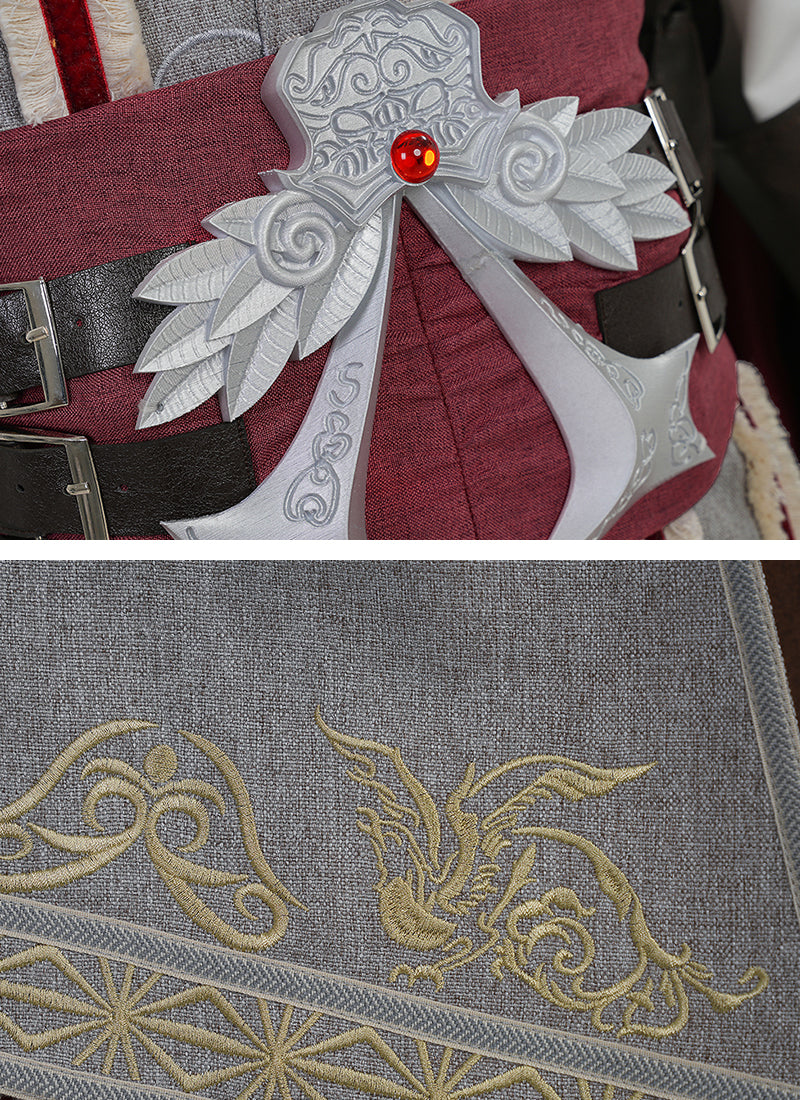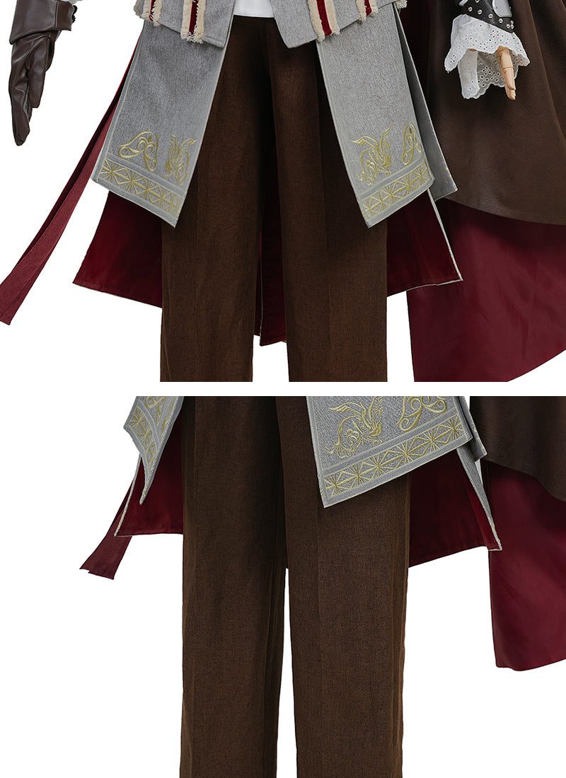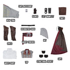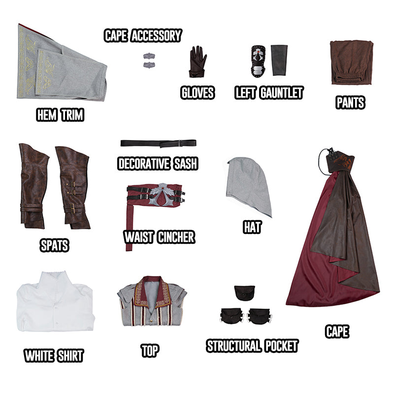Including: Hem Trim, Cape Accessory, Gloves, Left Gauntlet, Pants, Spats, Decorative Sash, Waist Cincher, Hat, White Shirt, Top, Structural Pocket, Cape