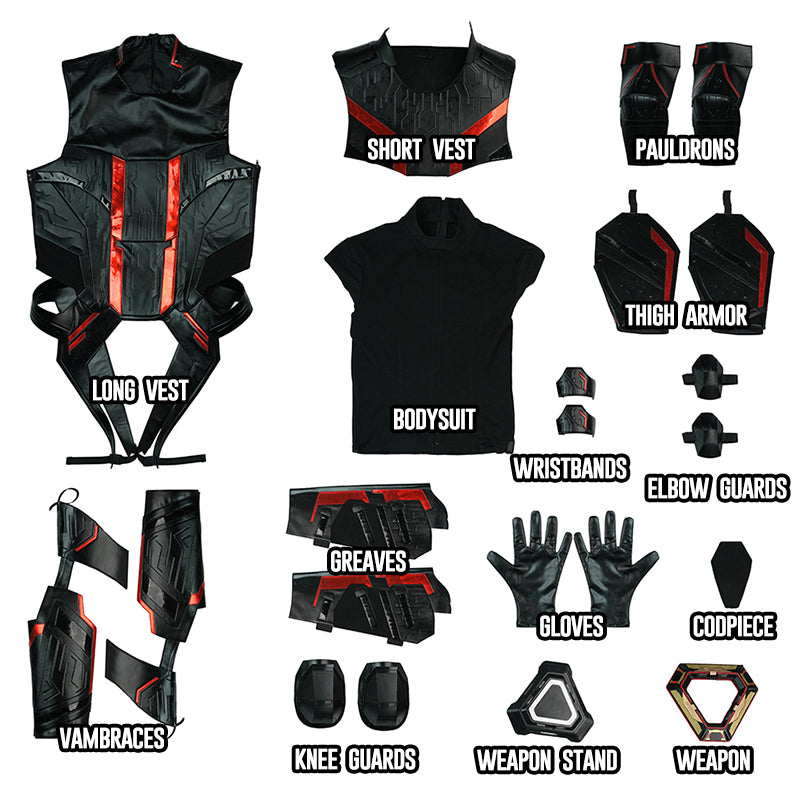 Including: Long Vest, Short Vest, Pauldrons, Bodysuit, Thigh Armor, Wristbands, Elbow Guards, Vambraces, Greaves, Gloves, Codpiece, Knee Guards, Weapon Stand, Weapon