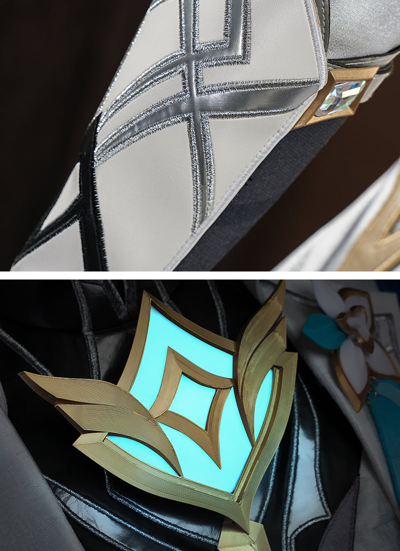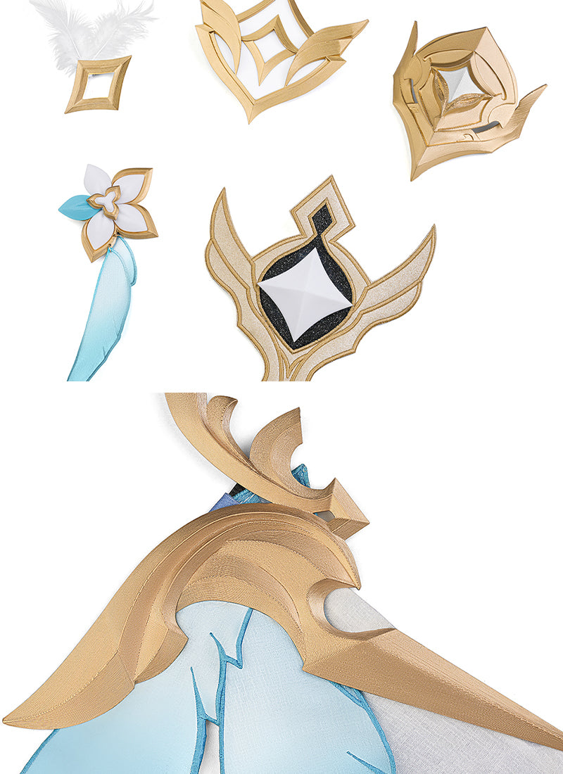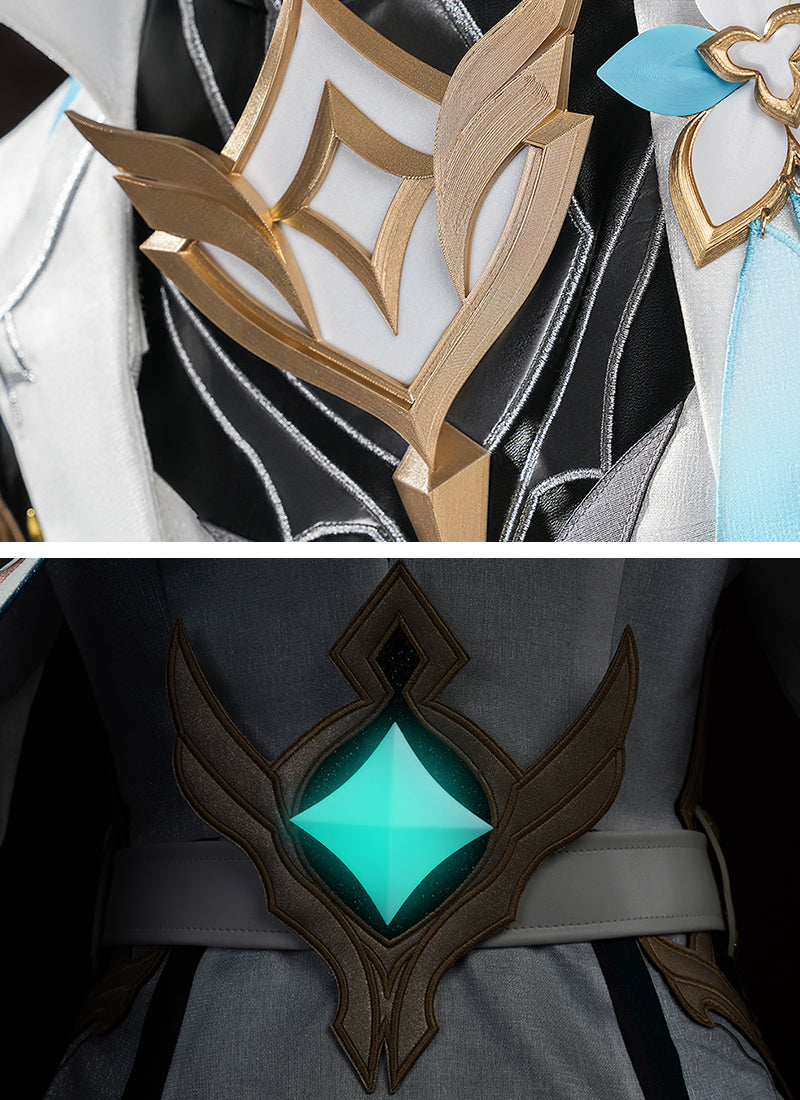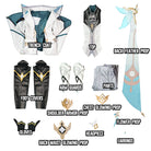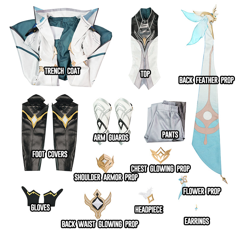 Including: Trench Coat, Top, Back Feather Prop, Foot Covers, Arm Guards, Pants, Shoulder Armor Prop, Chest Glowing Prop, Gloves, Back Waist Glowing Prop, Headpiece, Earrings, Flower Prop