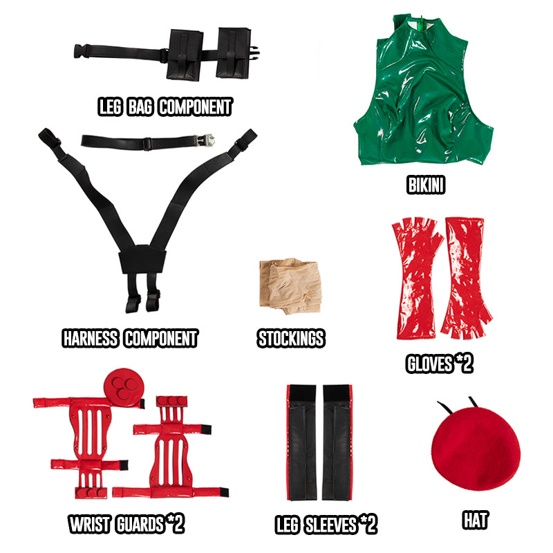 Including: Bikini, Leg Bag Component, Harness Component, Stockings, Hat, Gloves*2, Wrist Guards*2, Leg Sleeves*2