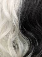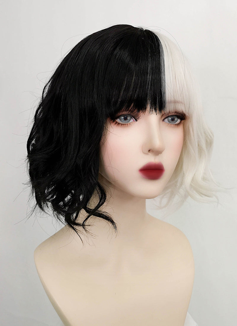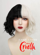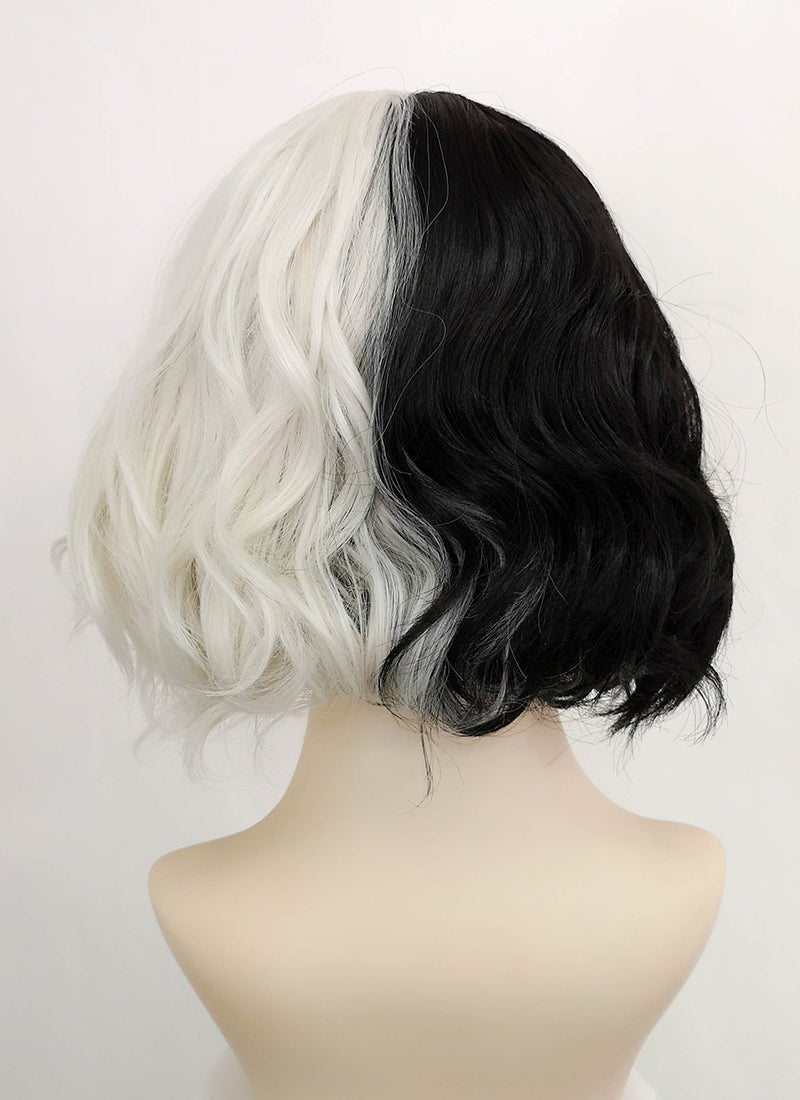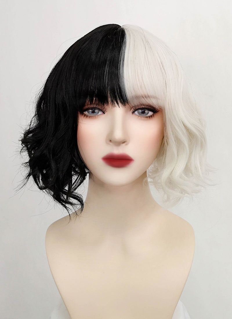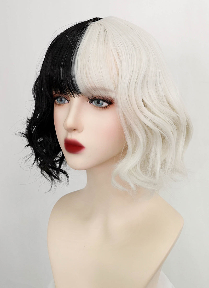 Disney Cruella Short Wavy Black Blonde Split Gemini Color Bob Cosplay Wig TBZ1173